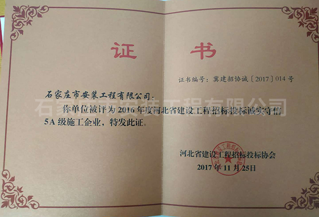 2016年度河北省建設工程招標投標誠實守信5A級施工企業